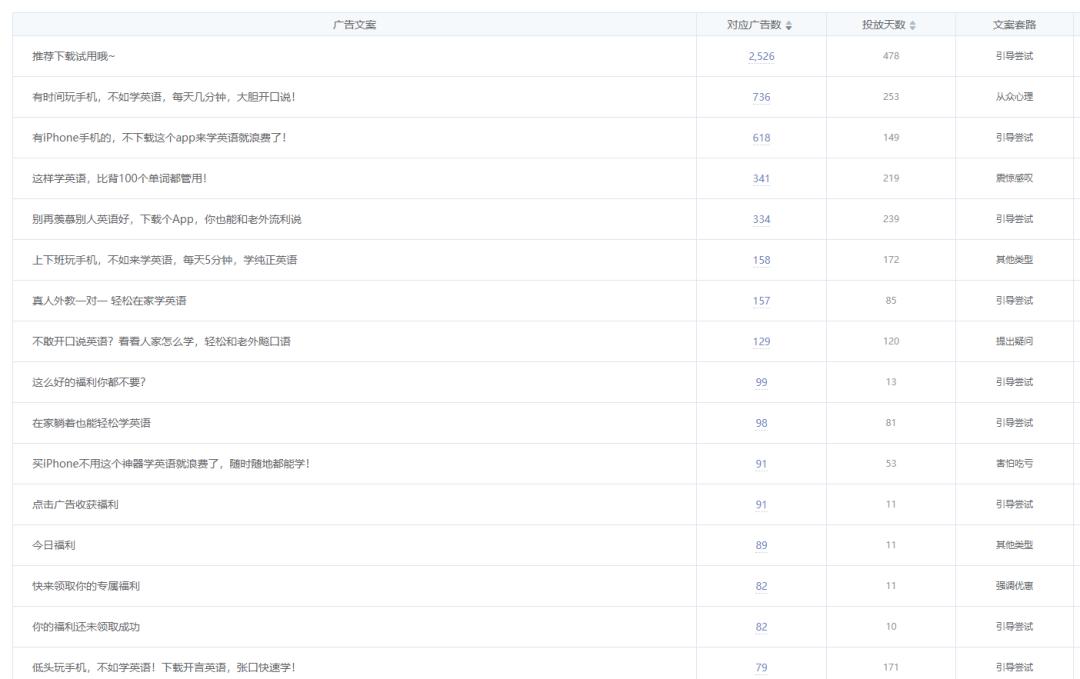 以下列出来文案,都是开言英语长期投放效果最好的文案,可以看出开言英语比较偏爱“引导尝试”的文案套路。