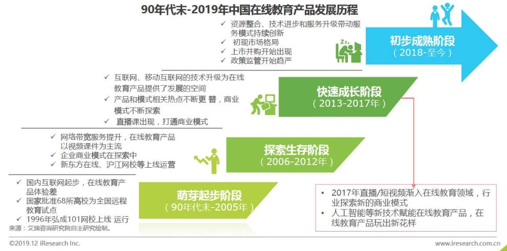 纵观在线教育的整个发展历程,每个阶段的过渡间隔越来越短,2020年,不见得是在线教育的风口,但肯定是一个新阶段的起点,从初步成熟过渡到全面发展,深化线下线上融合。