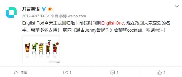 2012年2月3号开言英语注册了新浪微博,最早叫“EnglishOne”,猜测是想重新打造一个英语学习品牌,但是新品牌没有群众基础,冷启动比较困难。到4月17日又更名为“EnglishPod”,这样能更好地利用EnglishPod积攒下来的口碑。