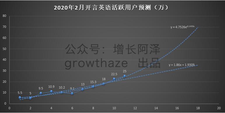 这里截取2018年9月(这个时候开始做付费投放)到2019年7月份的数据,结果显示到2020年2月份,开言英语的预测月活在35万~70万之间,相对于流利说英语的800万月活还有不小的差距。