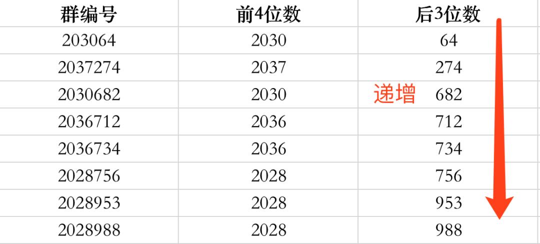 每个群平均在250人左右,群名中的编号都是诸如“2030682”、“2028756”、“2036734”、“2028953”、“2028988”,结合我早期加入的体验营群编号,列出了下面一张表(编号已进行脱敏处理):