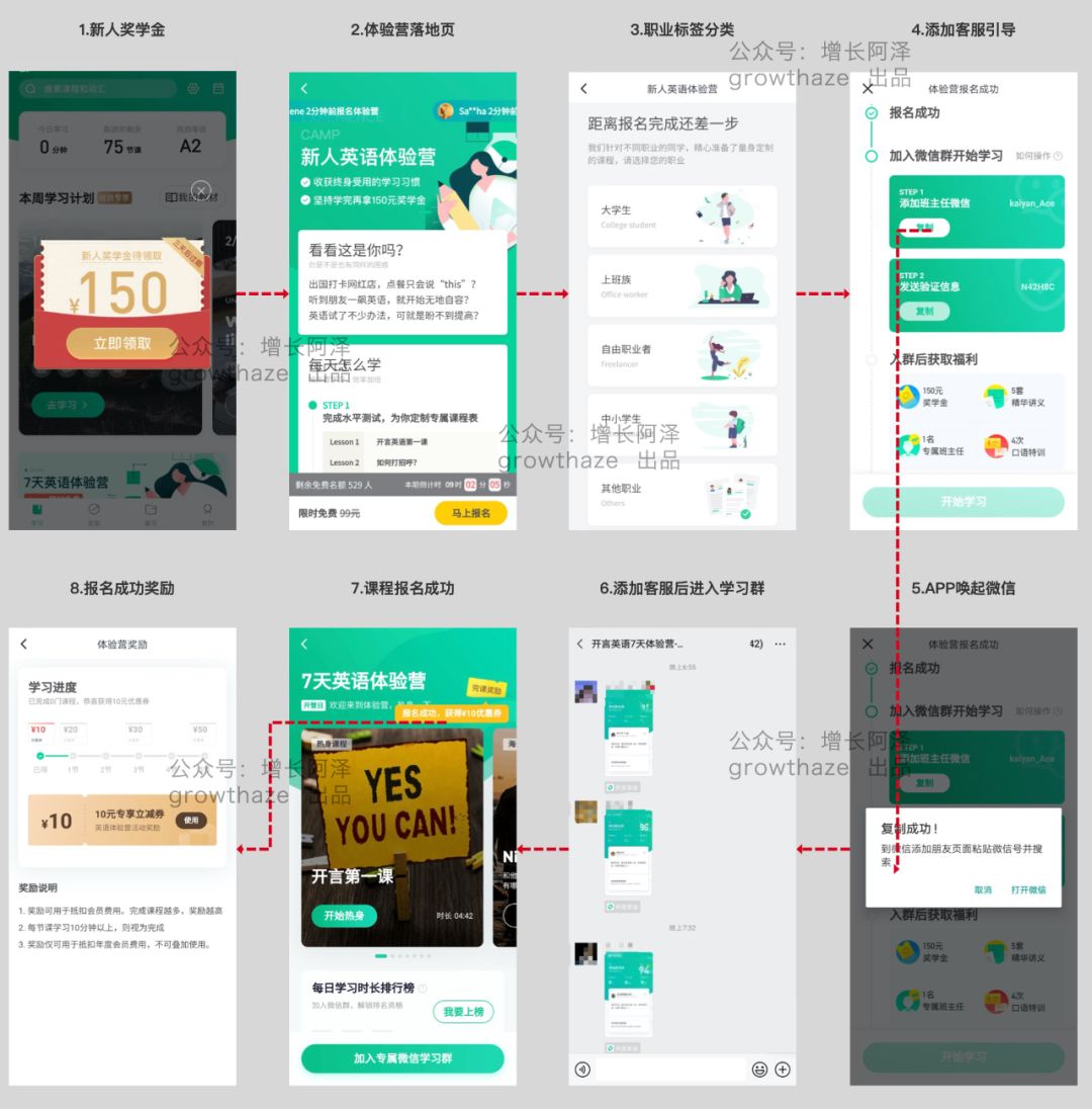 开言英语的体验营在用户激活、留存、转化上都起到了重要作用,从产品的引导到社群转化都是可以借鉴学习的。