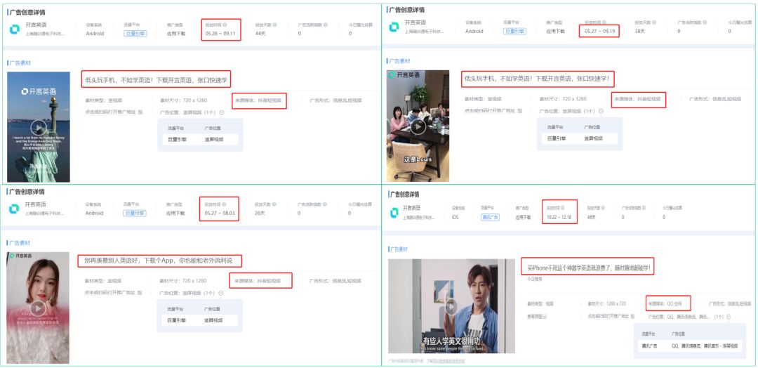 以上都是开言英语投放周期较长的广告创意,其中有一个19年5月份和papi酱合作的视频。