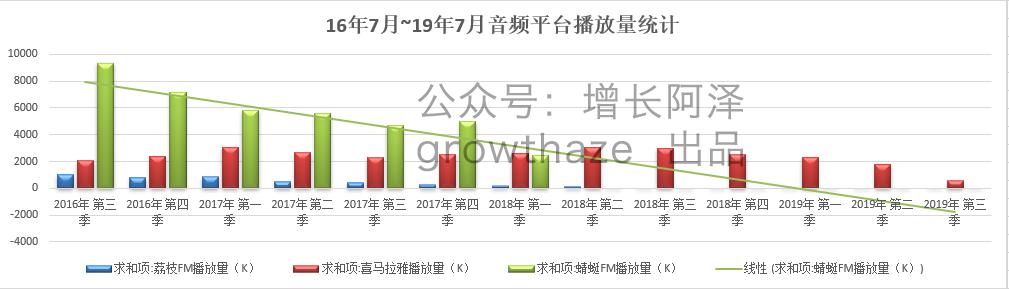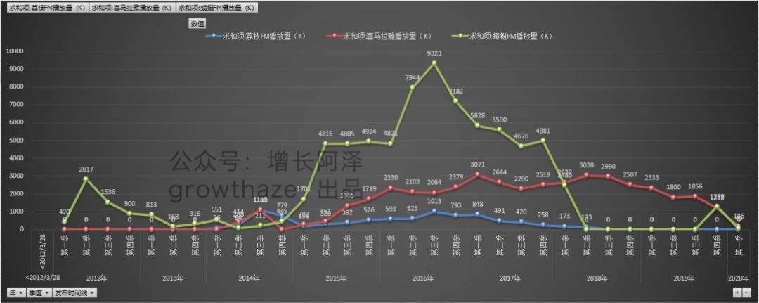 为了帮助大家更清晰了解整个发展趋势,我通过爬虫抓取了《潘吉Jenny告诉你》这档节目,在蜻蜓FM、荔枝FM、喜马拉雅三个平台的播放数据进行透视分析,得到下面这张图。