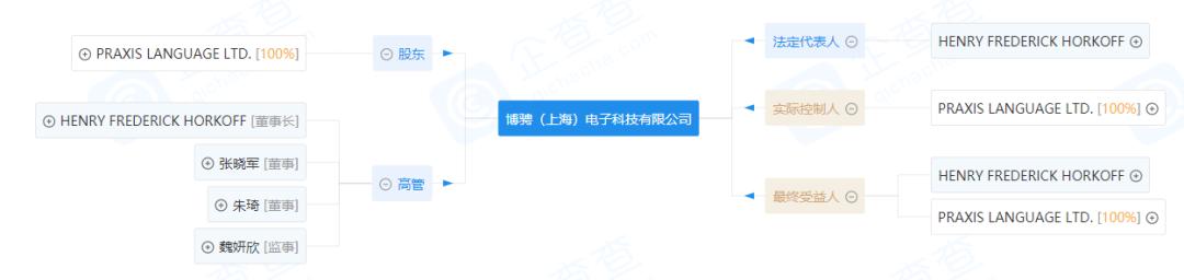 Praxis Language Ltd是一家在美国注册的公司,实际办公地点在上海,国内注册的公司是博骋(上海)电子科技有限公司,由Praxis Language Ltd 100%持股。