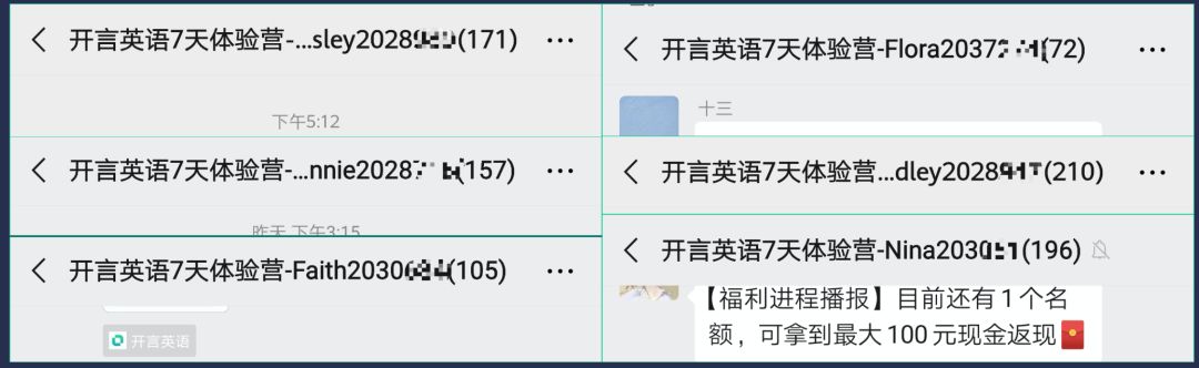 于是我愉快地将开言英语体验营推荐给了几位朋友,顺便统计了他们加入体验营的群名称、用户数。