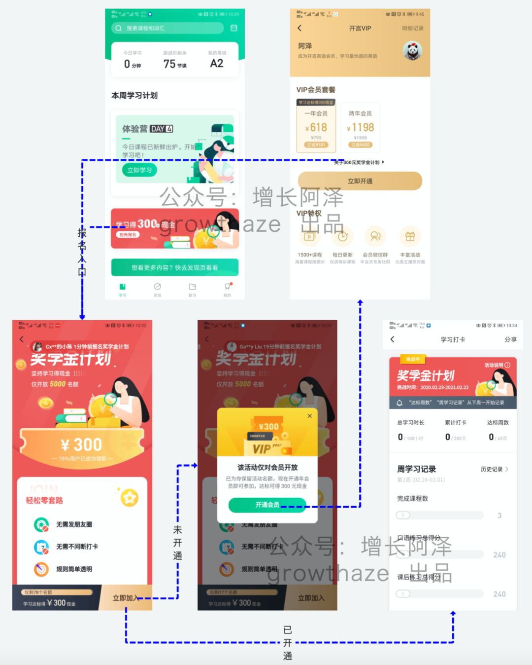 相对于“7天体验营”和“组队学习”,“300元奖学金计划”在引导转化上更为直接。在学习和会员页面都有入口,玩法与之前的薄荷阅读、流利说英语“奖学金计划”类似。