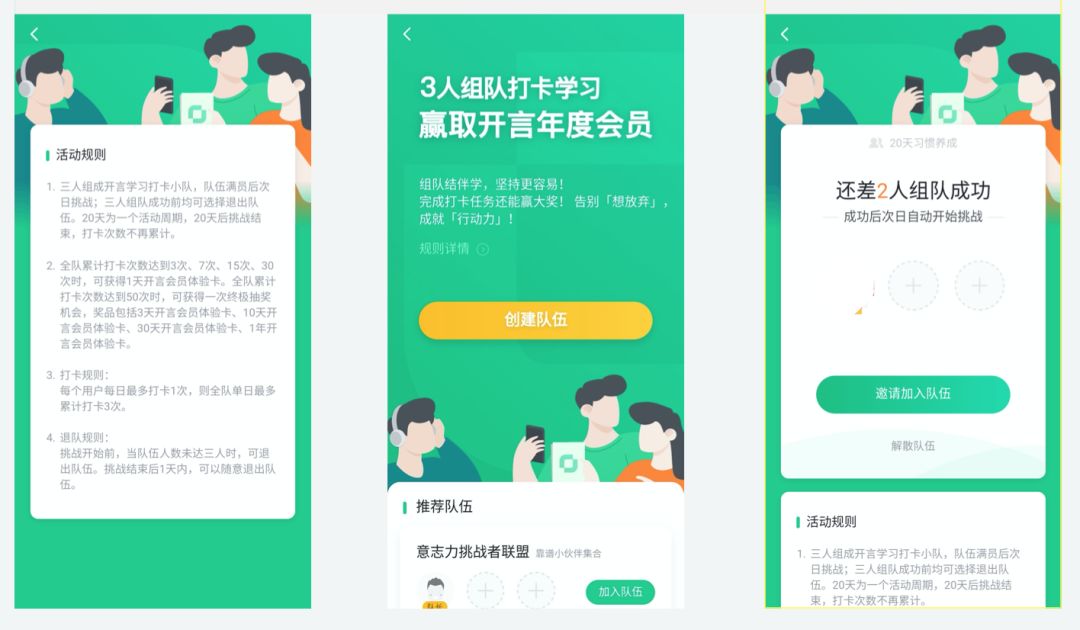 3人组队完成20天打卡学习,全队累计打卡天数达到50次,即可抽取3天~1年不等的会员体验卡,这能对未付费的用户吸引力更大,同时能提升用户的活跃度。