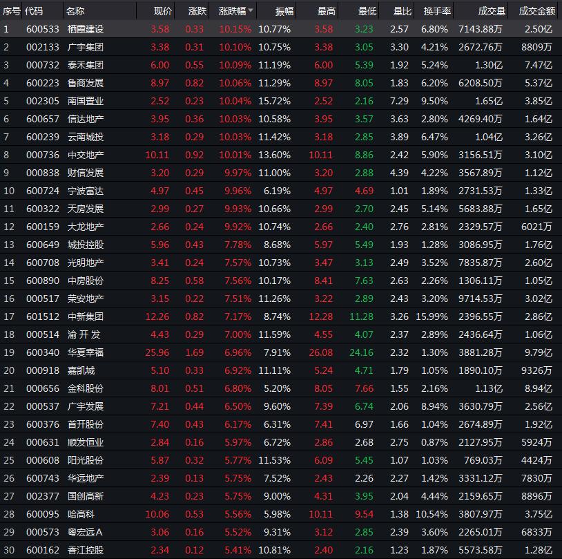 12只地产个股涨停,其中包括栖霞建设、广宇集团、泰禾集团、鲁商发展、南国置业、信达地产、云南城投、中交地产、财信发展、宁波富达、天房发展和大龙地产。