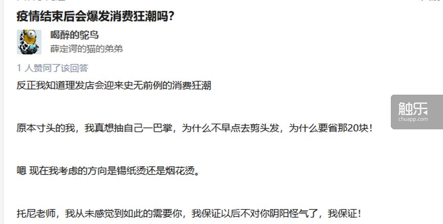 在知乎“疫情结束后会爆发消费狂潮吗?”这一问题下面,小张写下了这样一句话。