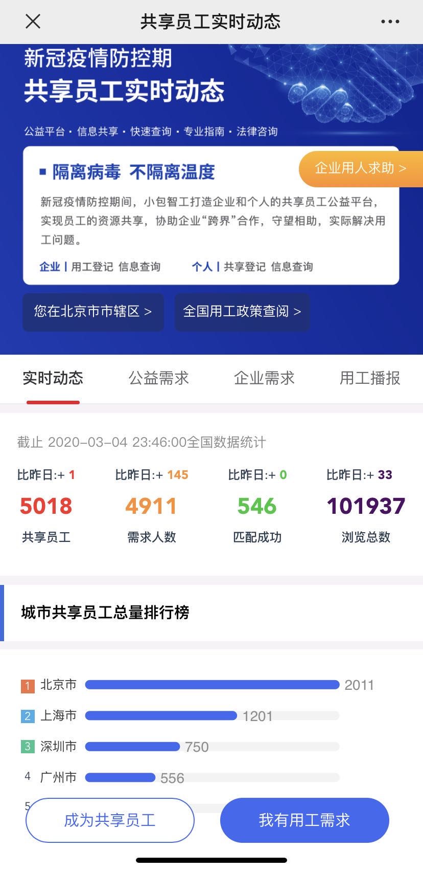 近期,小包智工正在加紧上线针对疫情防控期间的共享员工信息平台。该平台是一个公益平台,通过收集各个城市内不同企业的临时用工需求,来帮助企业匹配所需的人手,促进不同企业间员工的信息和人员共享。