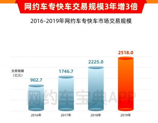 过去几年,以滴滴为首的巨头终于培养起了用户手机叫车出行的习惯,网约车的交易规模也一直水涨船高,网约车宝典APP调查数据显示, 2016年至2019年底,专快车交易规模由902.7亿增长至2518亿元,累计增长近3倍。