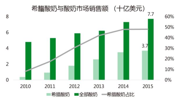 这个品牌做了什么事情?看下面这张图,你会发现希腊酸奶在整个酸奶类目当中也是一个非常小的品类,但它占整个酸奶的比例,在数年内有一个非常快速的提升,从一开始的5%以下增长到50%,也就是说在美国每卖出两杯酸奶,就有一杯是希腊酸奶。