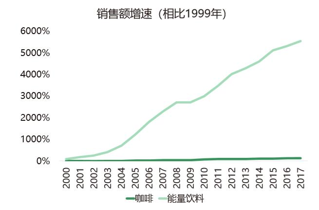 这是一个增速的图,我们把能量饮料和咖啡行业做了一个简单的对比,你会发现咖啡行业从2000年到现在大概只增长了百分之几十,而能量饮料行业的复合增速到了5000%,也就是说这个行业在快速地扩张。