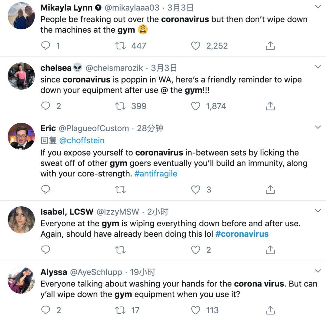 除此以外,相比担心冠状肺炎的传播,更希望健身者能自行擦拭消毒使用过的器械,是Twitter用户的发声。