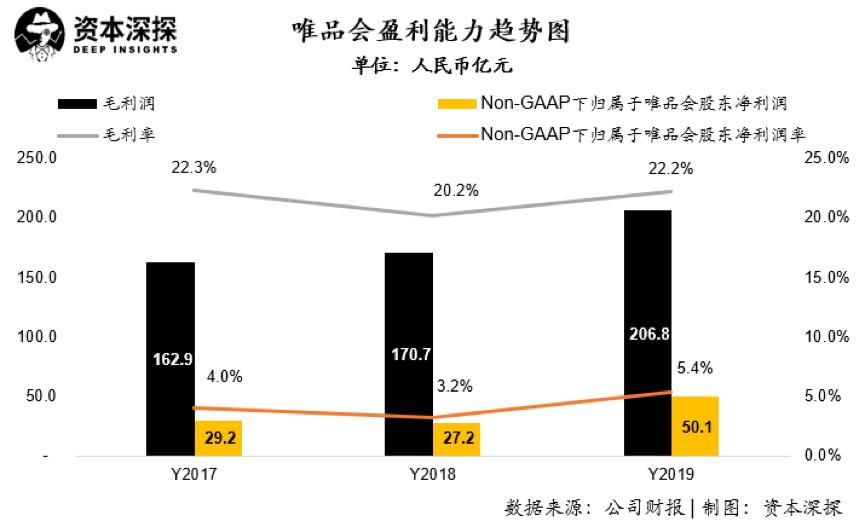 唯品会2019年取得毛利润206.8亿元人民币,毛利率为22.2%,较2018年提升2个百分点。