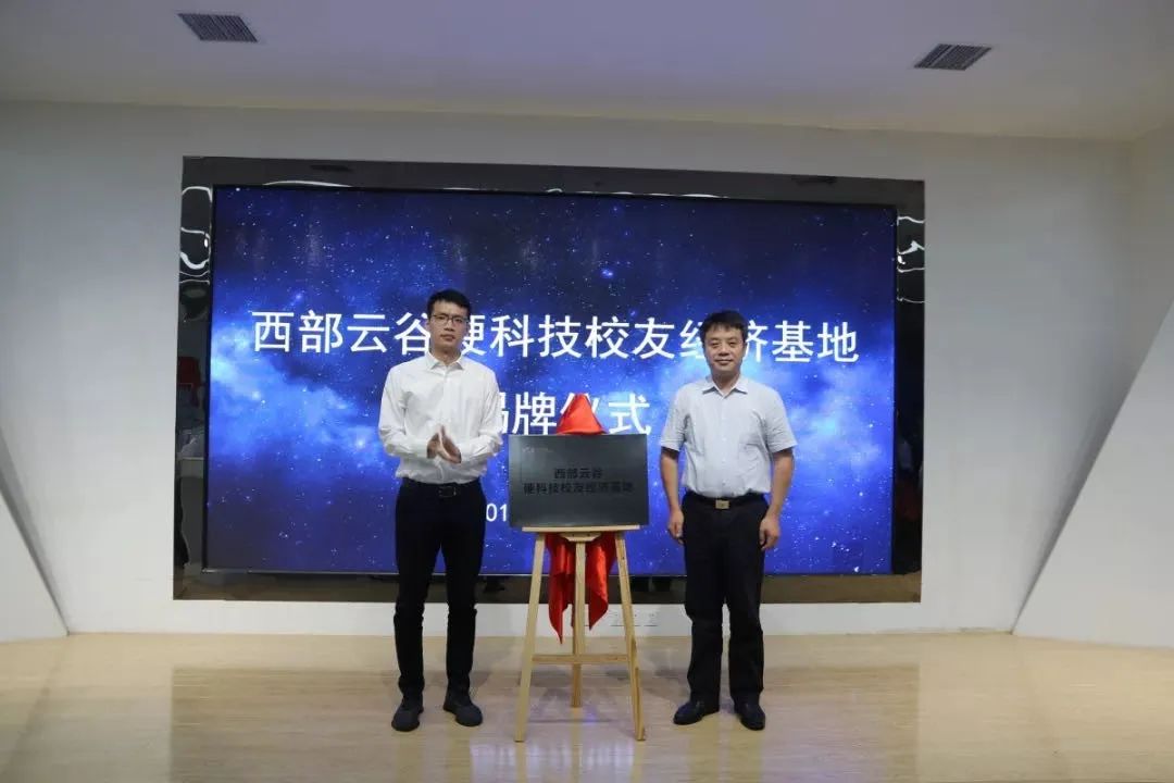 西咸新区党工委委员、沣西新城党委书记、管委会主任刘宇斌;西咸新区党工委委员、管委会副主任赵孝共同为西部云谷硬科技校友经济基地揭牌