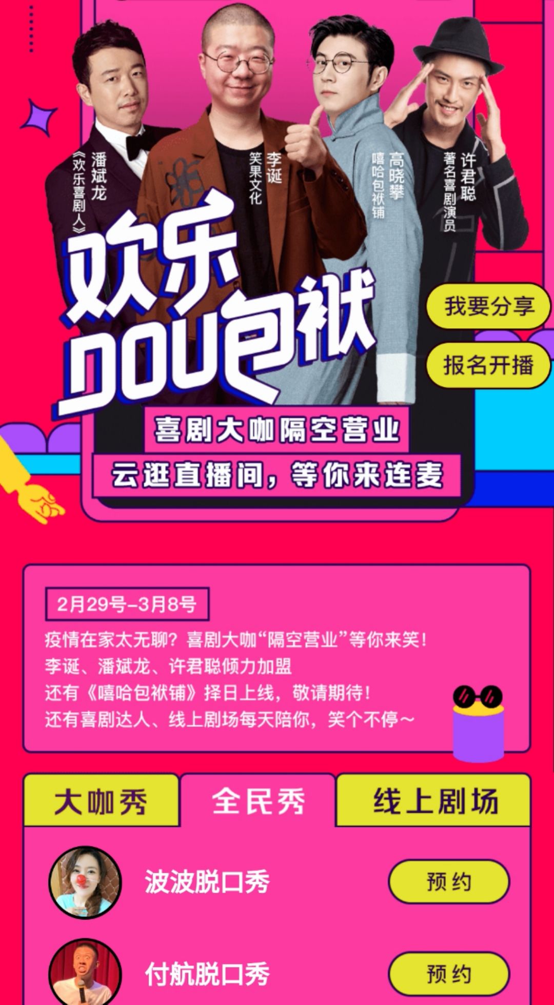 李诞先是在快手,和快手红人giao哥、老四,《野狼Disco》原唱董宝石GEM连麦,和笑果文化旗下艺人们一起开了一场“线上吐槽大会”;再到抖音“欢乐DOU包袱”直播栏目中,与三位抖音红人连线,为抖音“线上剧场”造势。