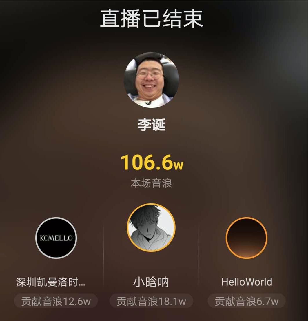 为了给直播做预热,抖音甚至还发起全网#一分钟画李诞#短视频话题,提前造势。一个半小时直播结束后,李诞收到106.6w音浪,换算后为10.65万元,一度登上抖音直播热榜首位。
