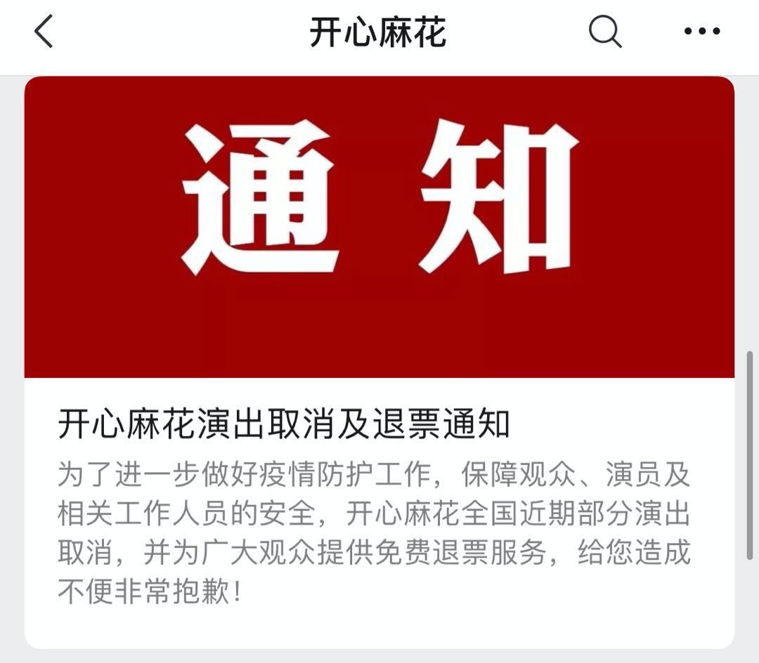 2月28日,笑果文化宣布,原定3月在加拿大、美国的巡演直接延期到7个月后;孟京辉戏剧工作室1月末至4月初,超20场话剧悉数取消;开心麻花则取消了包括北京、上海、深圳、广州等城市,37个演出项目。