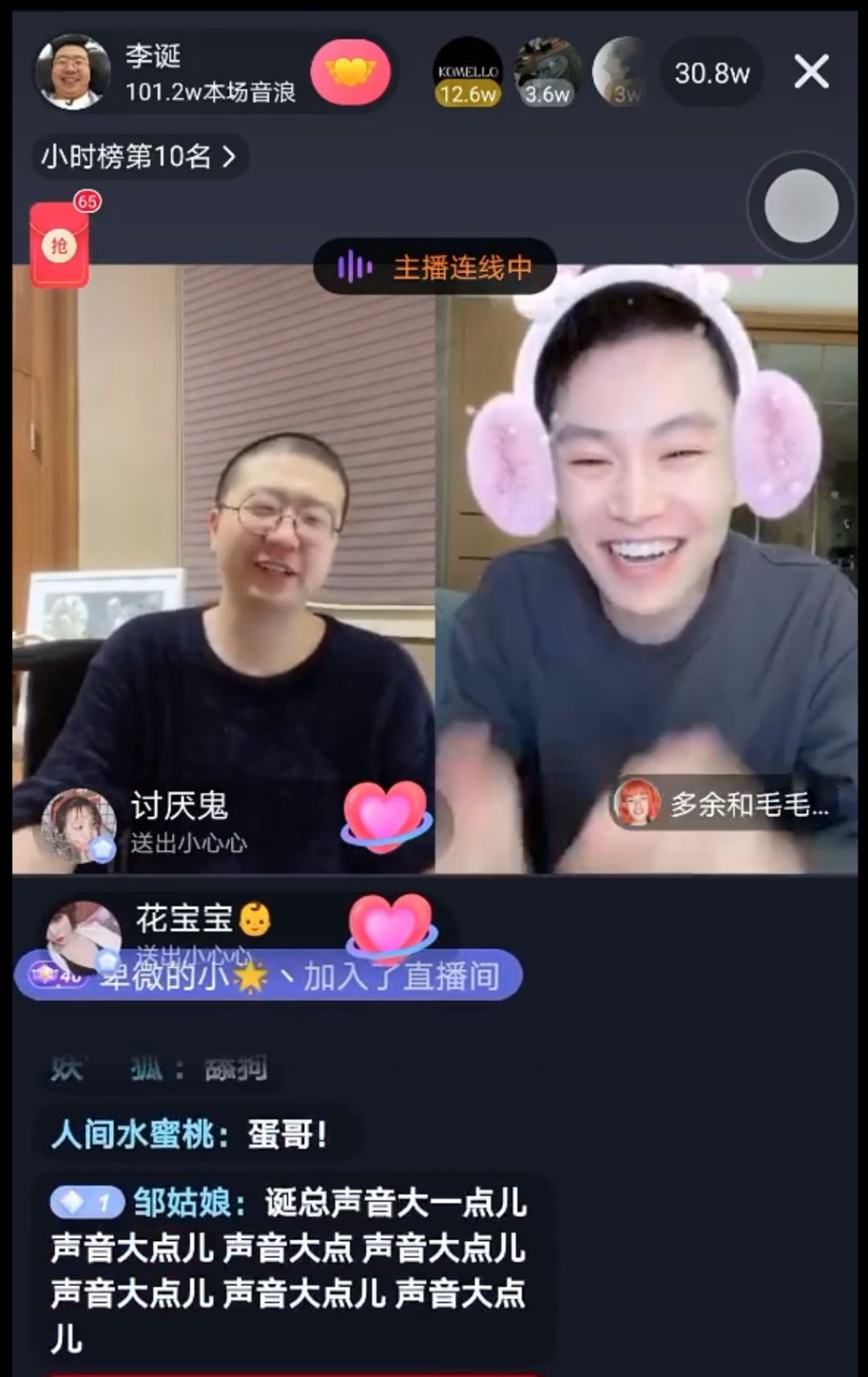 “我的朋友圈已经看到倒闭好几家了”,3月1日,在抖音与达人“多余和毛毛姐”连麦时,李诞打趣说,“现在就靠直播了”、“最近打算好好当一名主播”。