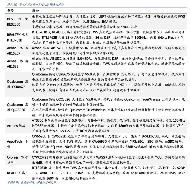 据国盛证券2019年市场研究报告数据,截止2019年4月,全球已有包括高通、络达、瑞昱、恒玄和炬芯等在内的8大芯片厂商,共推出了18款TWS蓝牙芯片解决方案。