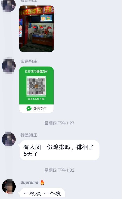 一位老哥想吃鸡排,就在群里扔一个微信二维码,祈求众筹一份鸡排。
