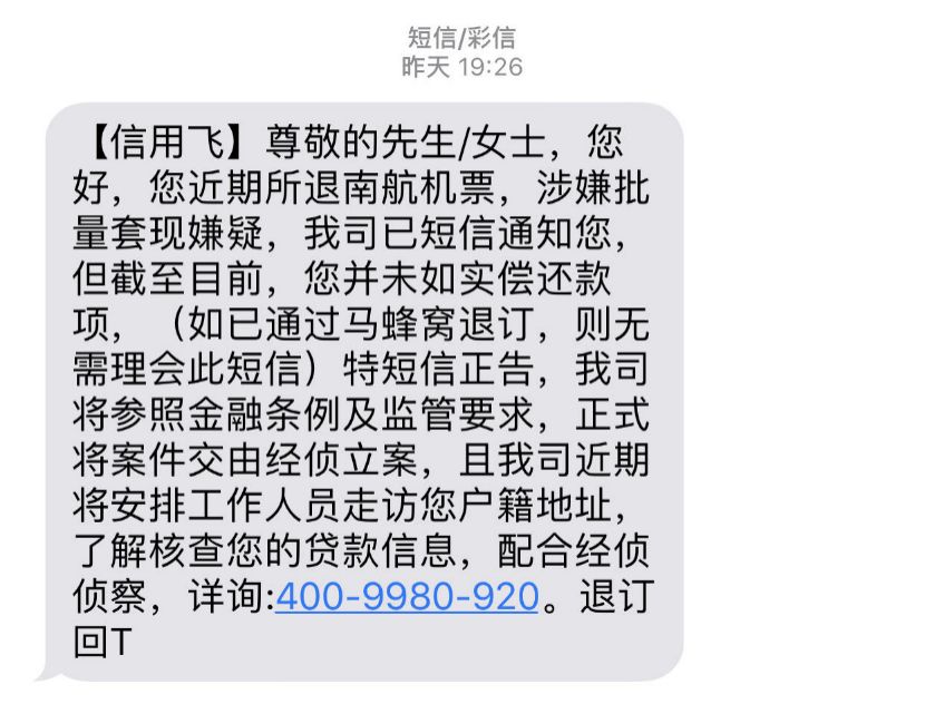 陈静平表示,自己就曾经收到了信用飞的套现警告:“您近期所退南航机票,涉嫌批量套现。”