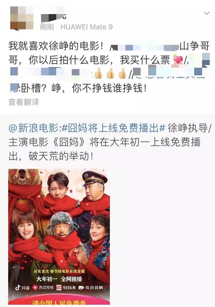 但世界永远是辩证的。《囧妈》的免费上线迎合了大众,也对同期撤档的《唐人街探案3》《夺冠》等电影产生了道德压力,当时观众市场里“《囧妈》免费上线了,XX为什么不上线”的偏激绑架言论并不少。这引起了其他电影粉丝的反感。