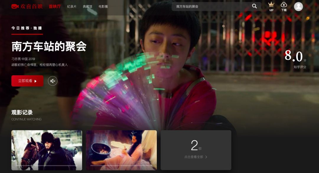 欢喜首映走的是精品化与差异化路线,主打的关键词是“极简、轻奢、无广告”,为用户精选海内外优质电影。2018年贾樟柯导演的《江湖儿女》在欢喜首映上全网独播,平台迅速引起公众注意。