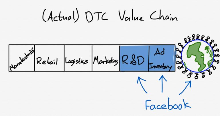 这就是DTC公司面临的问题:跟其他任何一家公司相比,Facebook确实更擅长寻找客户。这意味着,获取客户的最佳投资回报率要找Facebook,DTC公司正在跟所有其他DTC公司和移动游戏开发商以及现有的CPG公司以及其他所有人进行竞争以吸引用户的注意。这意味着真正的赢家是Facebook,而DTC公司却因不断增加的客户获取成本而慢慢喘不过气。让这一领域运转的是Facebook,因此,Facebook从DTC的价值链里面获取了大部分的利润是很自然的事情。