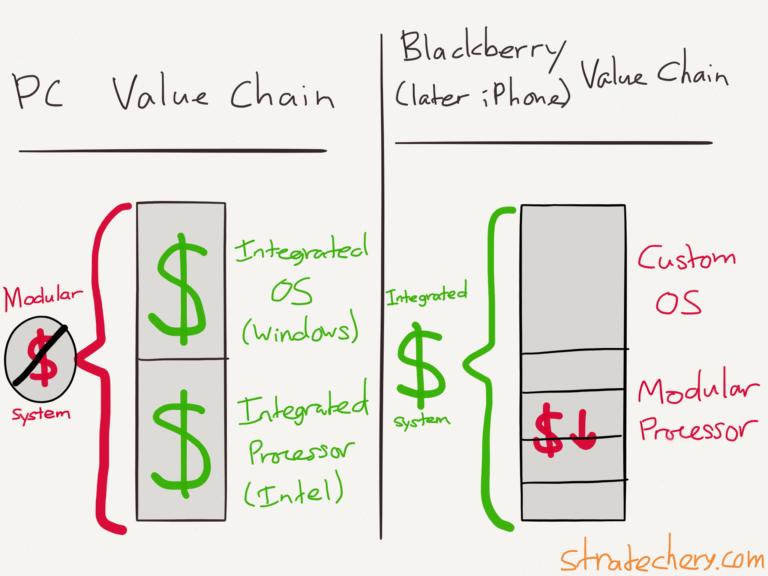 PC是一个模块化的系统,其集成部件可赚走了全部利润。另一方面,黑莓(以及后来的iPhone )是利用模块化组件的集成系统。不过要注意的是,这种举例非常简化。