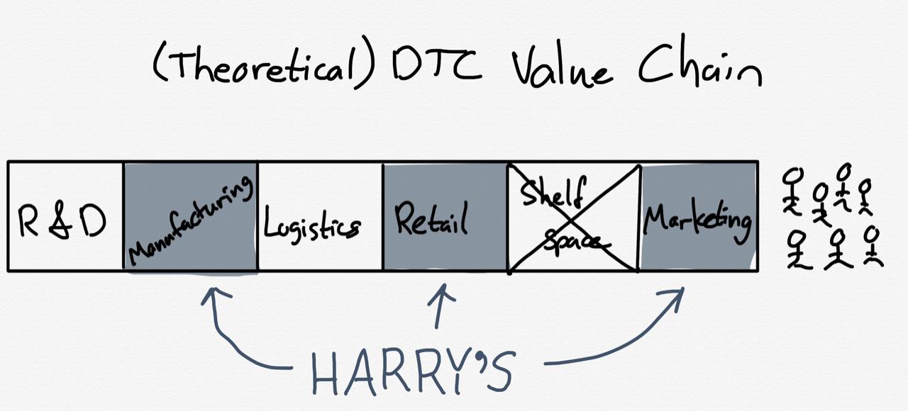 与此同时,DTC公司则认为,在过度服务的市场里面,研发变得不必要了(就像我在Dollar Shave Club的背景下所指出的那样,剃须刀是过度服务一个特别明显的例子),而且在互联网上,货架空间实际上是无限的。他们的目标是将营销、零售和生产整合到一起: