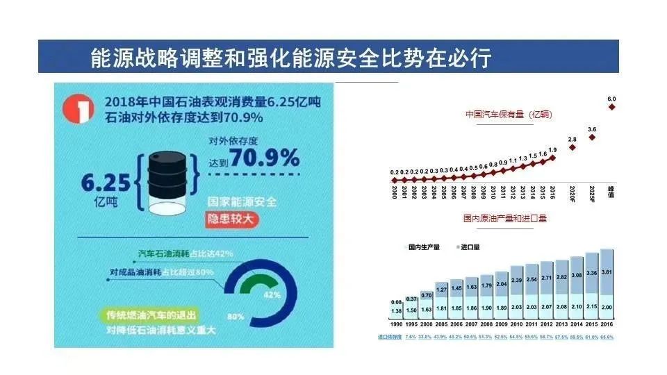 (1)中国能源战略调整势在必行,我们是贫油的国家,石油只能产2亿吨左右,2018对外依赖度达到70.9%,汽车用油如果不解决依赖度就会居高不下,如果用新能源汽车取代或者部分取代燃油汽车就可以解决石油的对外依赖。