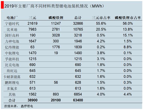 2019年宁德时代三元和铁锂电池装机量均排第一