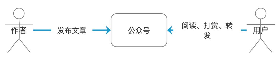 公共号的业务逻辑其实非常简单。就是作者(我们这里把所有内容输出者均称为“作者”)发布文章到公众号上,然后通过内容来吸引用户订阅、阅读、打赏、转发等。