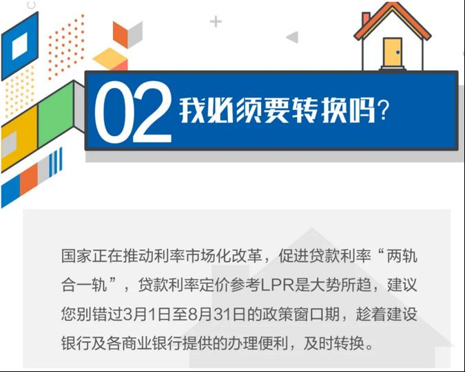 3月1日起,存量按揭贷款的定价基准,要从原来的基准利率,转换到LPR定价下的利率。刚才说了,5年期的LPR,未来还将处于下降通道。自然,大多数百姓都会选择换到LPR(而不是固定利率)。有意思的是,银行宣传这项政策时,也鼓励大家切换到LPR,下面是建行的宣传。