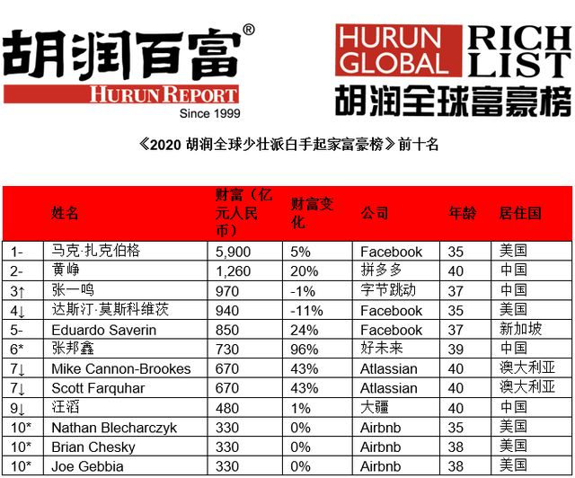 2020胡润全球少壮派白手起家富豪榜
