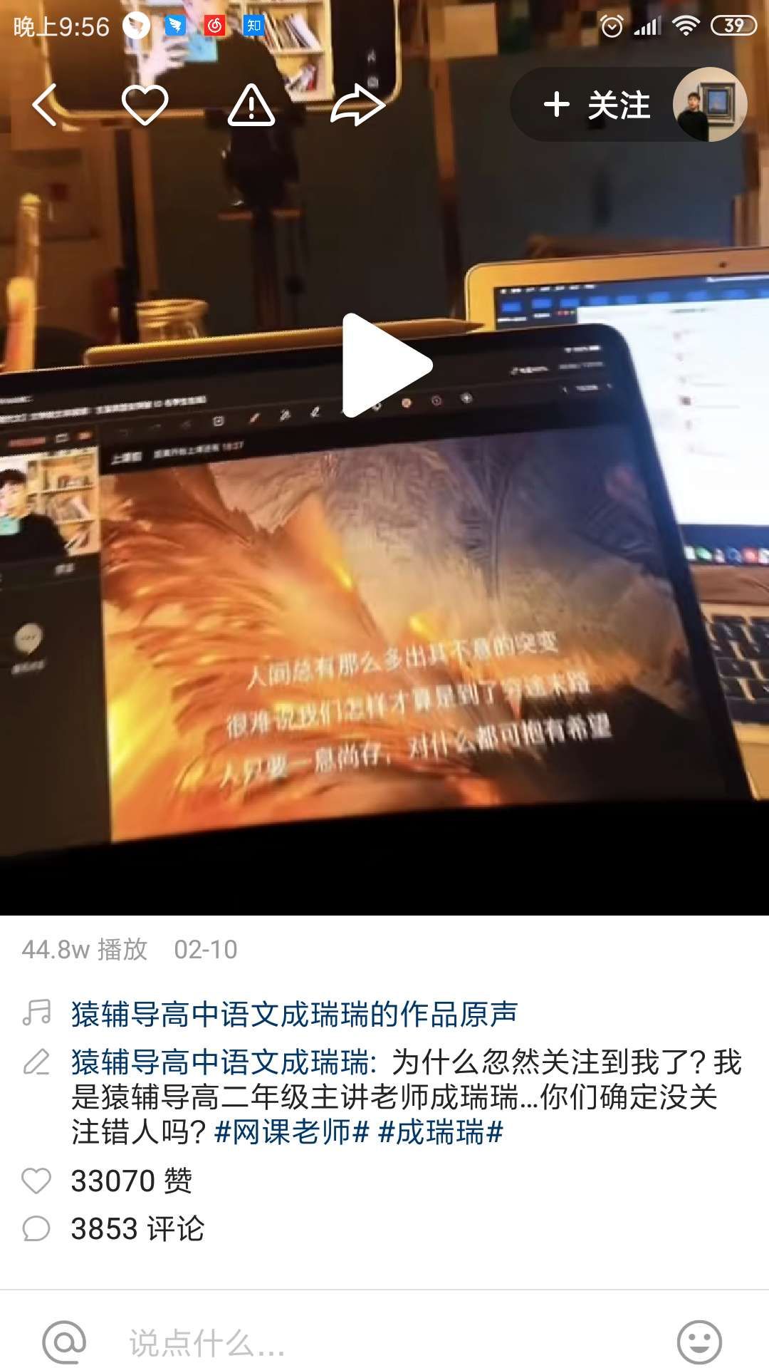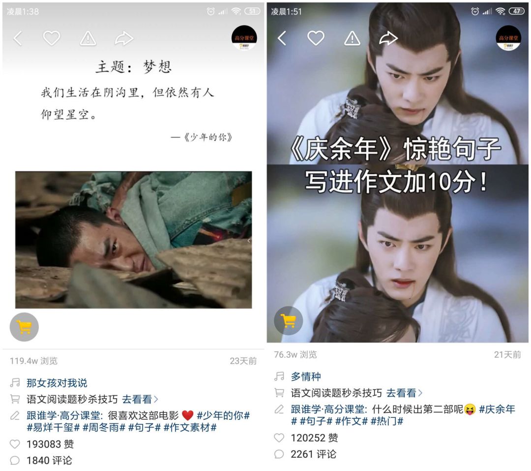 比如旗下语文类账号,视频配图全是帅哥美女,不乏热剧、动漫截图。不仅天然吸引学生群体的关注,还引起了这类剧目、动漫粉丝的注意,最后再辅以热剧、动漫里金句名言配合BGM播放,很容易引起共鸣,二次扩大受众圈。