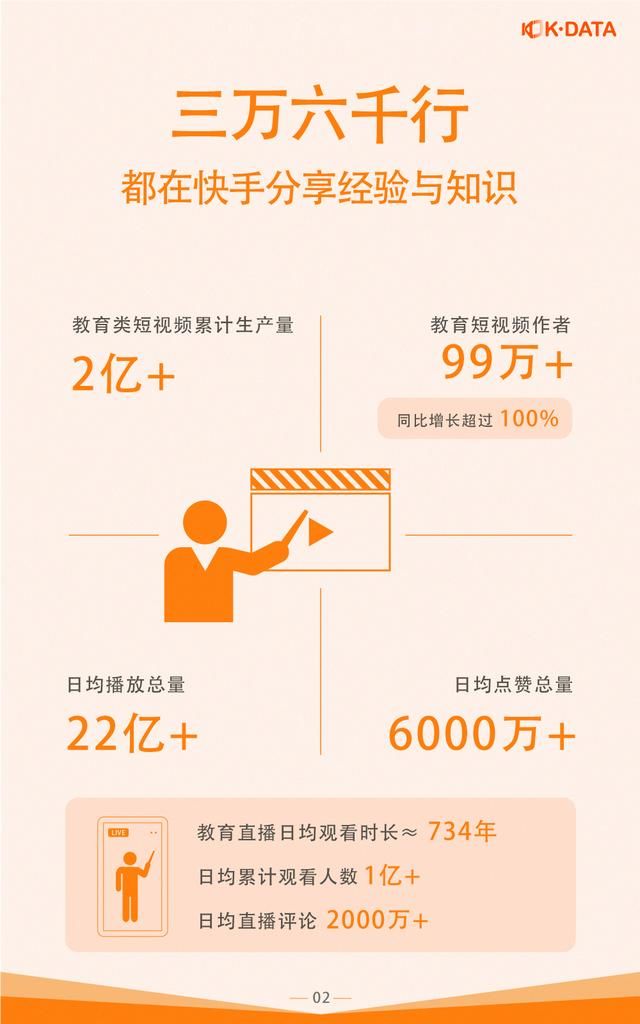 根据快手大数据研究院发布的《2019快手教育生态报告》显示,目前快手平台上与教育相关的短视频创作者超过100万,教育相关内容的直播日均播放达到22亿次,覆盖超过1亿人,日均观看时长加总约为734年。