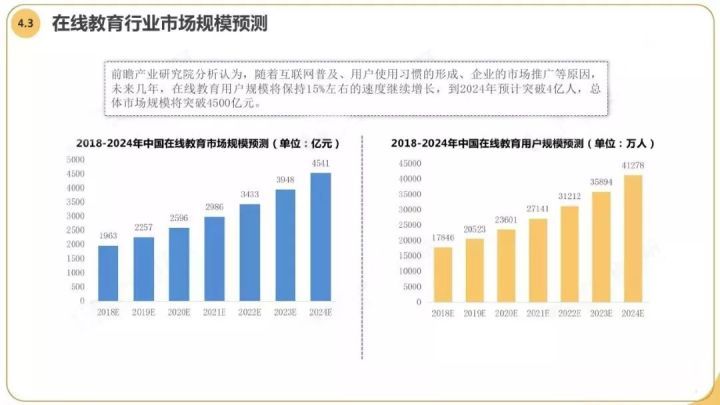 根据前瞻产业研究院发布的《2019年中国在线教育行业市场前瞻分析报告》数据显示:未来几年,在线教育用户规模将保持15%左右的速度继续增长,到2024年预计突破4亿人,总体市场规模将突破4500亿元,市场潜力非常大。