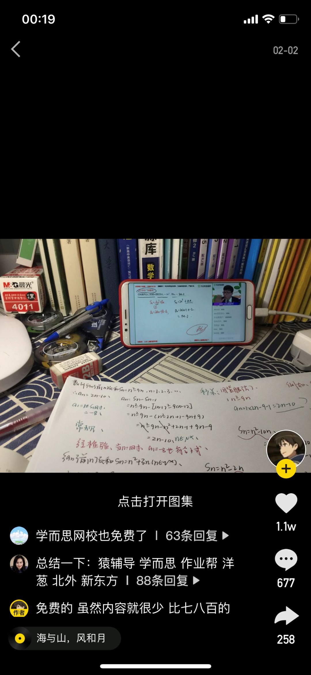 【作业帮官方账号】注册于2019.2.28,至今发布作品102个,发布频率自2019年12月开始,变得趋于周更,主要介绍作业帮直播课和相关老师,2月发布了29个视频,平均播放量1000+。