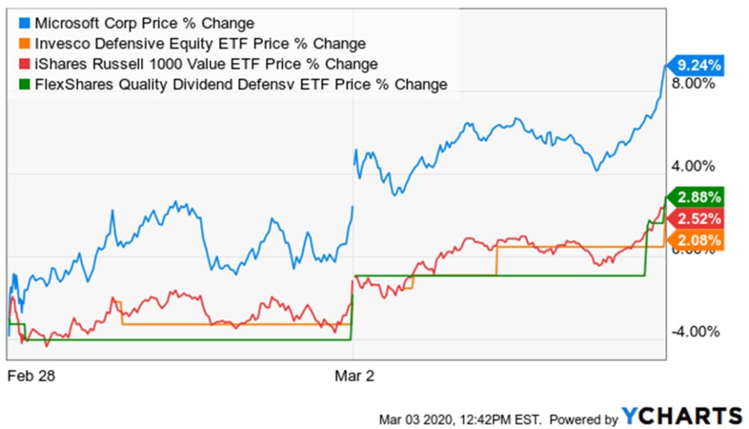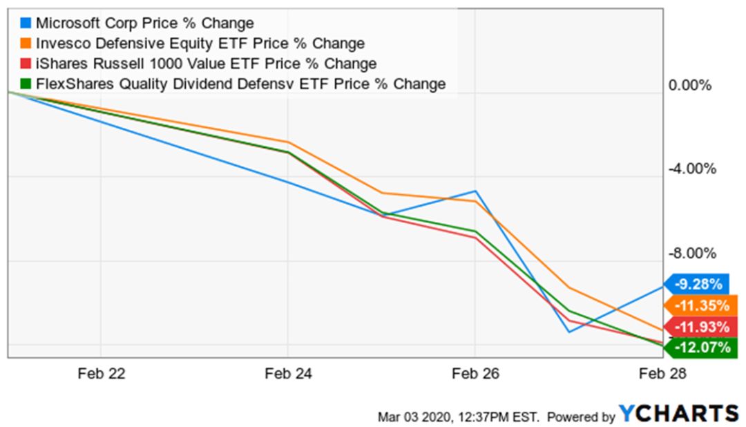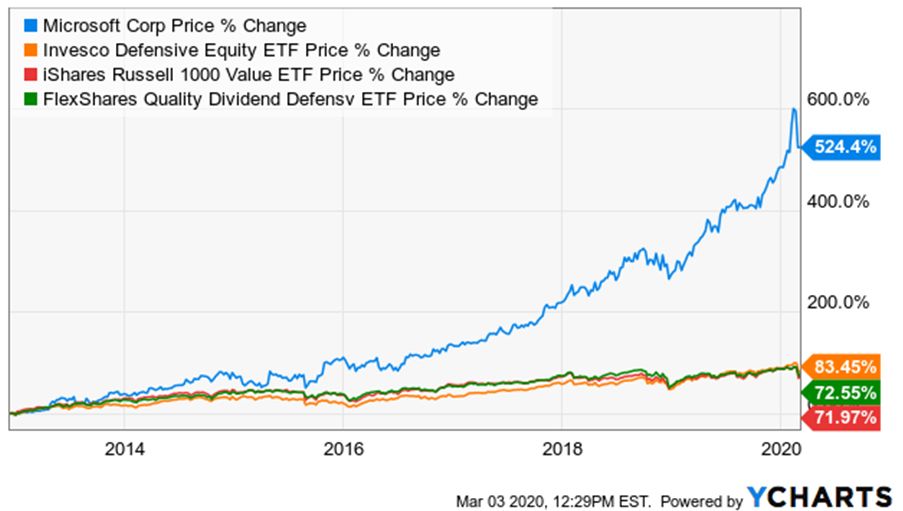 相比微软,市场更可能将其他公司视为防御性投资。先看下指数Invesco Defensive Equity ETF (DEF)、iSharesRussell 1000 Value ETF (IWD)以及FlexShares QualityDividend Defensive Index Fund (QDEF),这三只基金均针对风险控制型(主要投资于防御型公司)的投资者。过去几年中,微软表现远远超过了这三只。