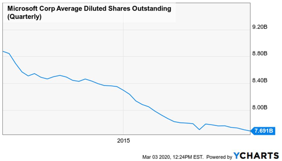 微软还一直回购其股票。这也为长期投资者创造了价值,利润和股息被更少的股票分配。