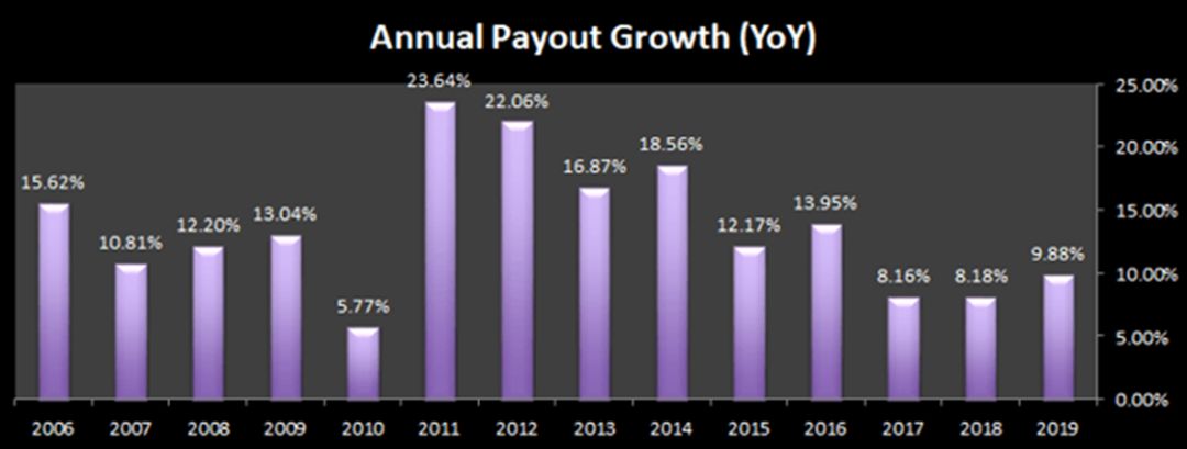 即使股息率降至历史低位(如上图),但公司同期的派息率依然较低(如下图),足以确保接下来几年的两位数增速增长。