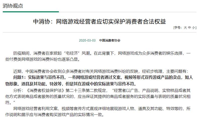 3月3日,中国消费者协会官网发布《网络游戏经营者应切实保护消费者合法权益》通知。