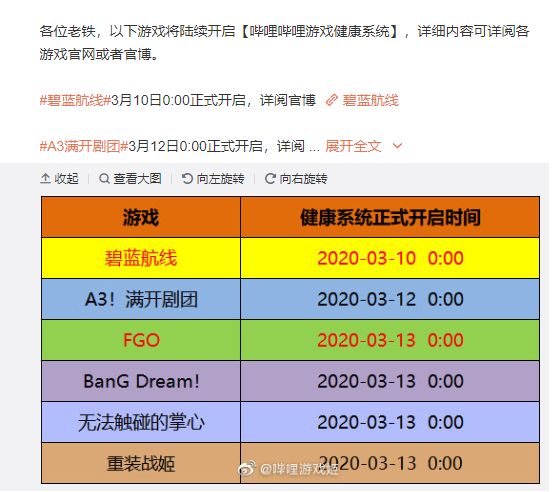 3月2日,B站宣布从3月10日起在旗下包括《碧蓝航线》《A3满开剧团》《FGO(命运/冠位指定)》《BanG Dream!》《无法触碰的掌心》《重装战姬》等游戏内接游戏健康系统,针对未成年用户的账号陆续开启登录时间段、登录累计时长、付费服务、游客账号登录的限制。
