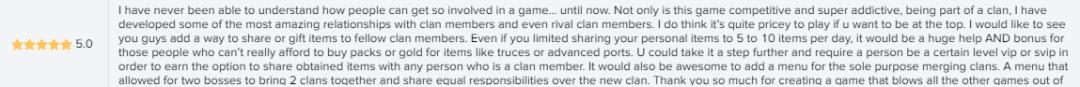“以前我一直很不解为什么有人会那么沉迷游戏,直到我在这款游戏里加入了一个帮派。我和帮派成员的关系都很好,甚至还和敌对帮派的玩家建立了联系。想要冲到排名高的位置的确需要很大花费,所以我希望看到有能分享资源的选项(哪怕有每日限制),也可以对分享加入vip等级的限制。我觉得类似的改动会更好地帮助帮派成员建立融洽的关系。”