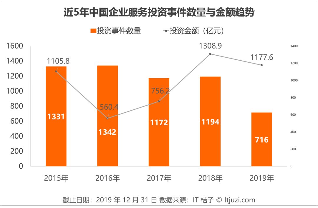 同样受整体资本市场遇冷影响,2019 年全年 IT 桔子统计到的中国企业服务市场投资案例数案例数为 716 笔,与 2018 年同期相比下降约 40%,是近 5 年披露融资案例数量最低。虽然投资笔数下降不少,但单笔投资金额却较高。