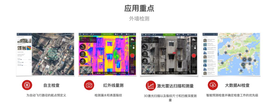 二是现场检测,通过筛选一些高危的建筑之后,需要到实地去检查。所用的方式有无人机,传感器如红外线、超声波、紫外线、雷达等方式,收集建筑物的多维度信息。